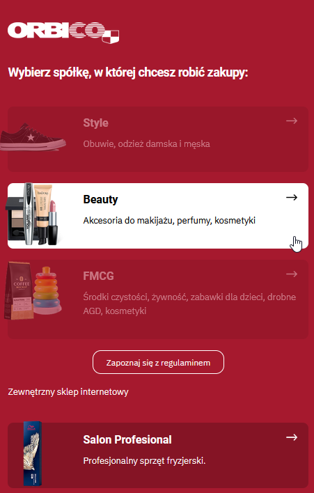 1. Sklep firmowy dla pracowników składa się z trzech modułów – każdy jest dedykowany innej (wirtualnej) spółce. Zaraz po zalogowaniu wybieramy, czy wchodzimy do Beauty, FMCG czy Style. Na tym etapie znajdziemy również bezpośrednie przekierowanie do sklepu spółki Salon tj. www.salonprofessional.pl