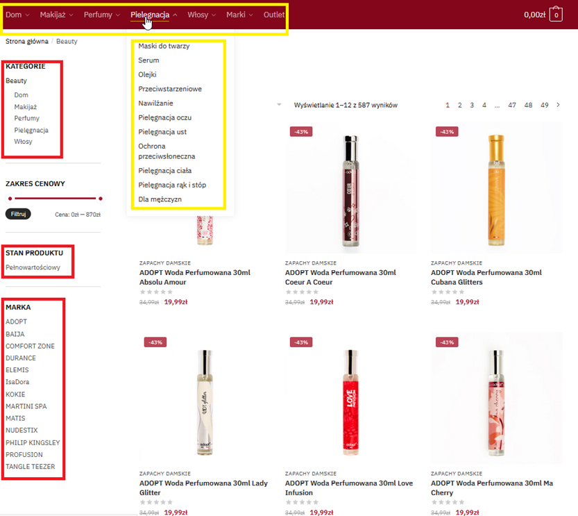 > Menu górne z rozwijanymi podkategoriami