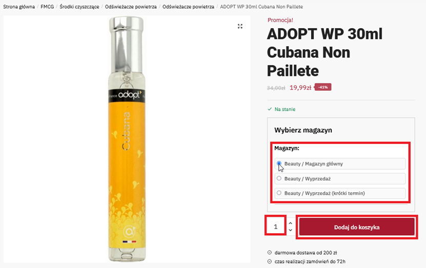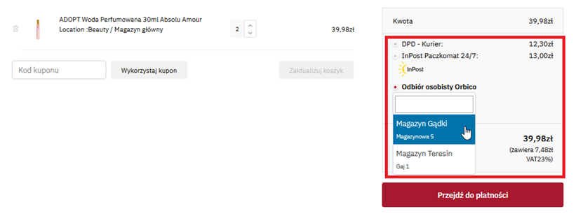 Przed dodaniem Produktu do koszyka Kupujący, musi wybrać jeden z magazynów z którego zostanie wysłany wybrany Produkt. Każdy z oddziałów Orbico (FMCG, Beauty, Style) posiada inny rozkład punktów magazynowych, który przedstawia się następująco: