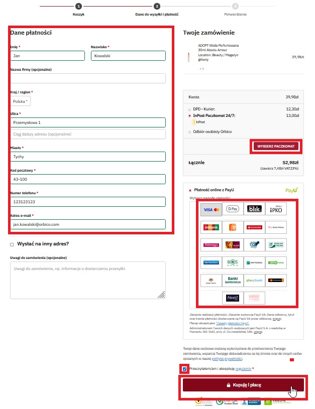 Na tym etapie uzupełniamy dane teleadresowe, jeśli wskazaliśmy jako formę wysyłki InPost Paczkomaty to wybieramy dokładną lokalizację paczkomatu. Zamówienie opłacamy z góry z pomocą płatności online PayU. Nie ma możliwości wyboru płatności przy odbiorze oraz płatności odroczonych.